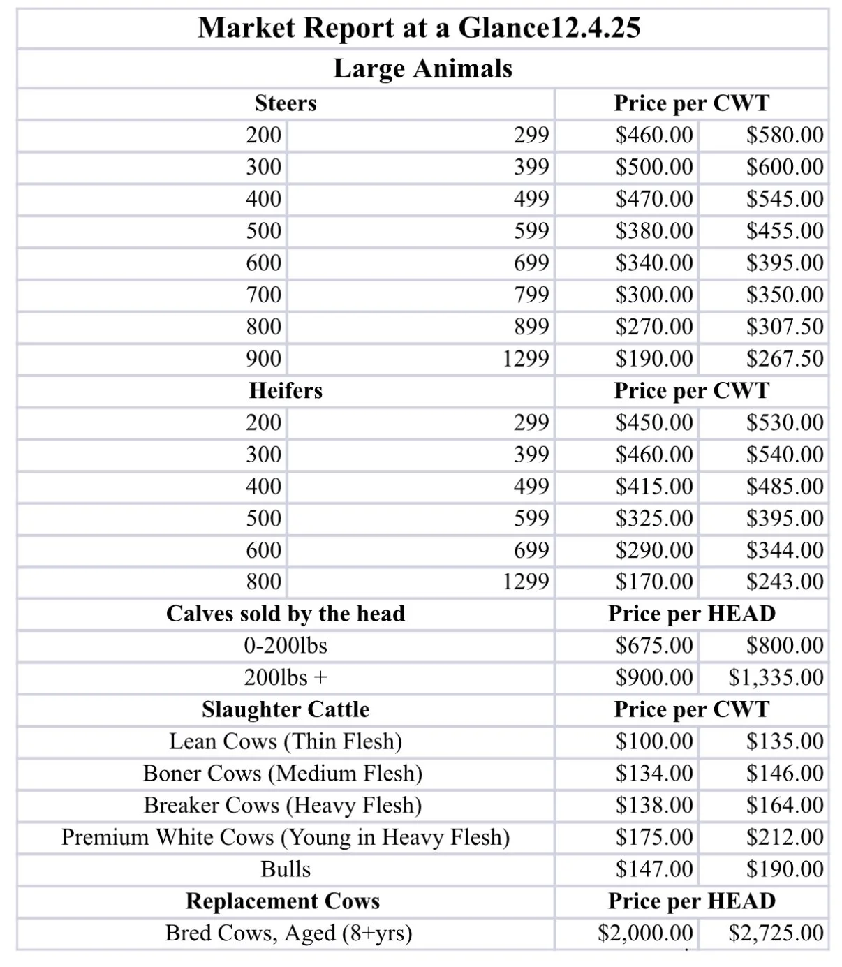 Starting in April of 2020 our market reports use the USDA format. This format has 3 pages, including: Feeder Cattle, Slaughter Cattle, and Replacement Cattle. To acquire a full understanding of the market report you will need to read all three pages by clicking on each separate tab.